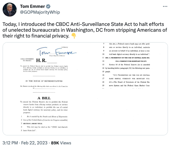 Emmer fue el primer miembro del Congreso en contraatacar a los CBDC a través de la legislación cuando presentó un proyecto de ley similar en enero de 2022. Ese proyecto de ley prohibía a la Reserva Federal emitir un CBDC minorista al prohibirle emitir “una moneda digital del banco central directamente a un individuo”. Adicionalmente, prohíbe explícitamente a la Fed ofrecer “productos o servicios directamente a un individuo”, y mantener “una cuenta en nombre de un individuo.”