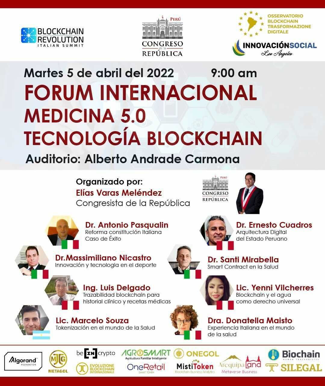 El día martes 5 de abril de 2022, se llevará a cabo el Forum Internacional Medicina 5.0 Tecnología Blockchain, en Lima, Perú. Un evento organizado por el Congreso de la República del Perú, el Osservatorio Blockchain Transformazione Digitale y Blockchain Revolution Italian Summit.