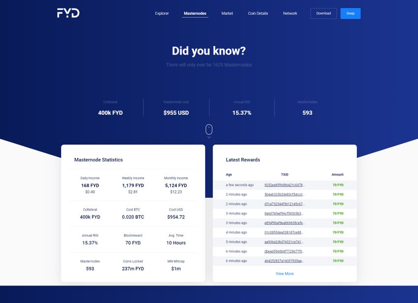 - Ingresos pasivos: puede ganar hasta un 10% en ingresos pasivos al hacer staking de FYDcoin, o alojar un masternode en su propio servidor para ganar un 15%.