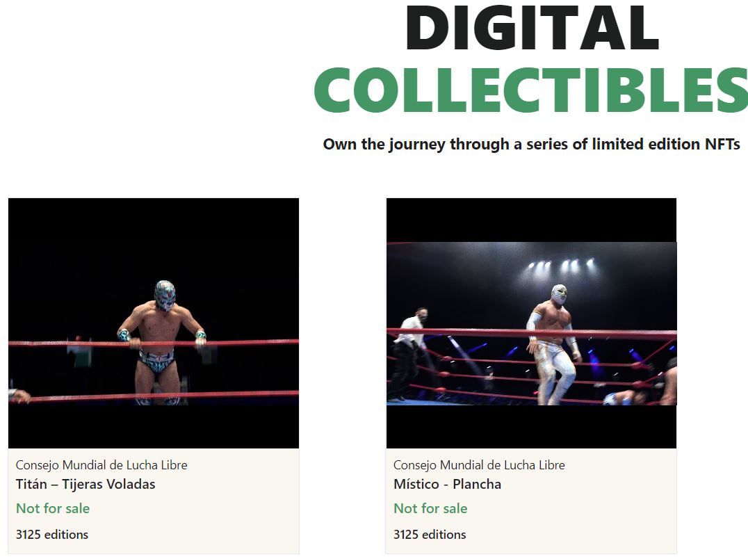 En tanto, el marketplace Sports Icon exhibe dos tarjetas con movimiento en formato NFT de muestra; se trata de Titán, con la postura “Tijeras Voladoras” y el luchador Místico con su postura “Plancha”. Ambas piezas digitales solo son una muestra de lo que venderá el CMLL próximamente.
