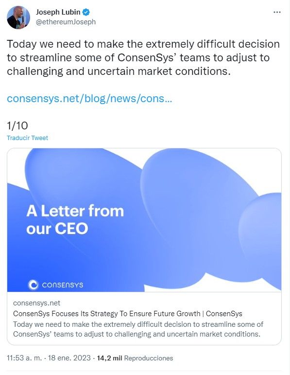 “Hoy tenemos que tomar una decisión extremadamente difícil”, así comenzaba el hilo de tweets de Joseph Lubin, cofundador de Ethereum y fundador y CEO de ConsenSys, una de las empresas más importantes dentro del ecosistema de la Web 3.0 que se está enfrentando a todos los problemas que han surgido con el bear market y el entorno macroeconómico.
