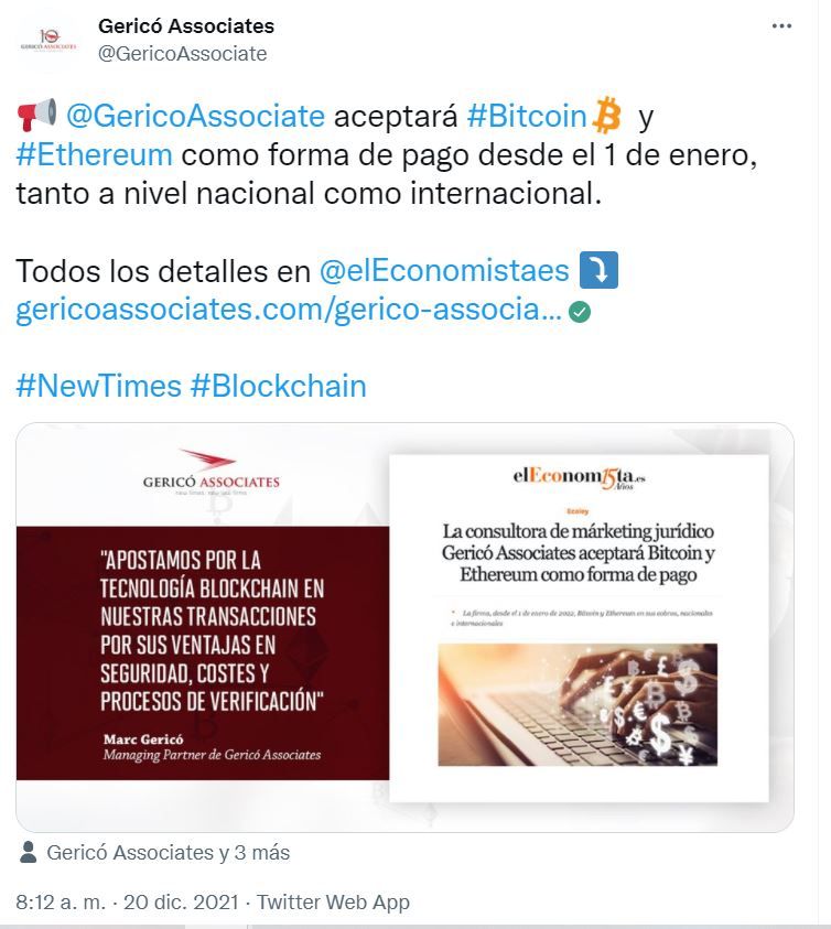 La consultora de marketing jurídico y comunicación legal, con operación en España y América Latina, Gericó Associates, reveló que comenzará a aceptar Bitcoin (BTC) y Ethereum (ETH) como método de pago, a partir del 1 de enero de 2022, en menos de un mes.