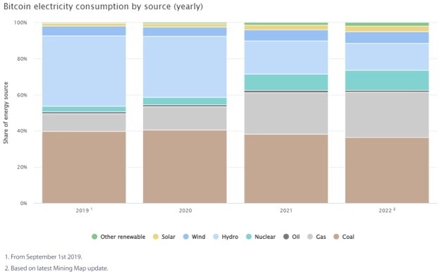 Por su parte, los combustibles fósiles representan un 62% del consumo eléctrico de Bitcoin, mientras que las fuentes renovables representan el 38%, según Cambridge. El índice señala que el uso de gas natural aumentó del 13% al 23% desde 2020 a 2021, mientras que la energía nuclear pasó del 4% al 9% desde 2021 a 2022.