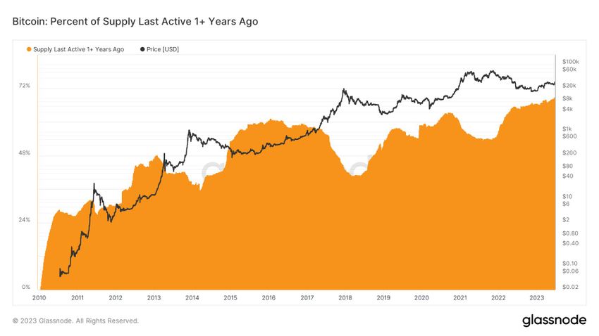 Todos los días se establecen nuevos máximos históricos en la cantidad de suministro de Bitcoin que no se ha movido en al menos un año.