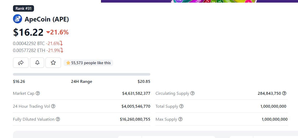 Tras su lanzamiento el 17 de marzo, ApeCoin se vendió por primera vez a 5 dólares, repuntando más del 200% en 24 horas, a 16,47 dólares. Desde entonces, alcanzó un ATH de 26.70 dólares a partir del 28 de abril.