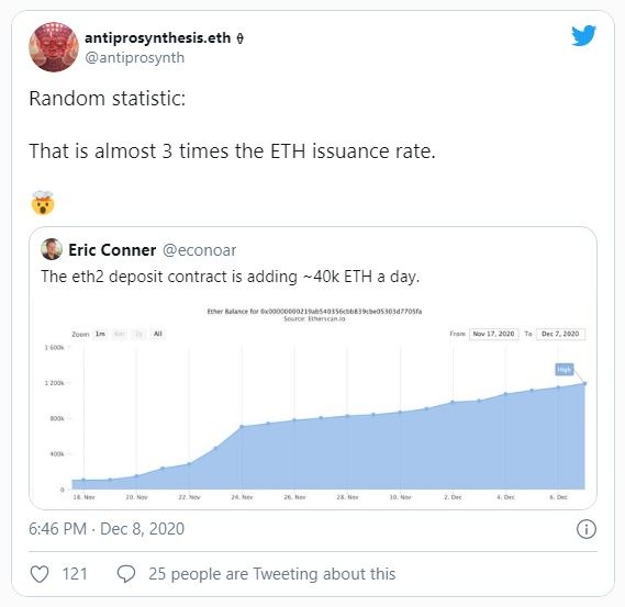 El usuario de Twitter @antiprosynth publicó una estadística interesante que muestra que la tasa actual de depósito es casi tres veces más alta que la tasa de emisión diaria de ETH. Es difícil decir si los depósitos continuarán a este ritmo, pero si lo hace, podría crear algunos problemas de oferta en el mercado de Ethereum.