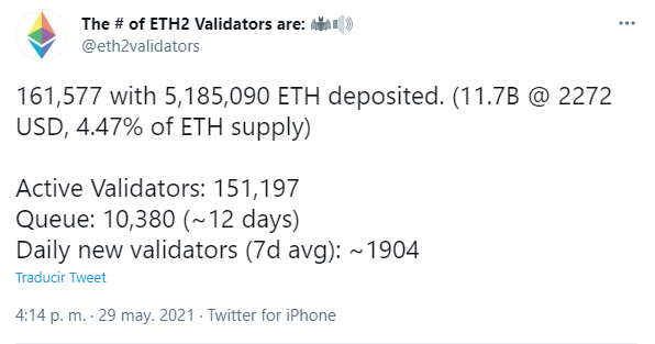 De acuerdo a la cuenta de seguimiento de validadores ETH 2.0, @eth2validators, para el viernes 28 de mayo existían 161,577 validadores de Ethereum 2.0 con 5,185,090 ETH depositados.