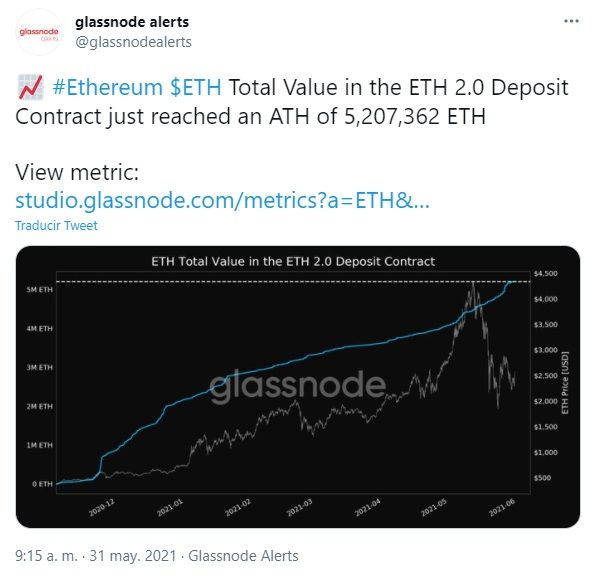 El lunes 31 de mayo, la cuenta de métricas on-chain Glassnode Alerts informó a través de Twitter que 5,209,474 ETH se habían transferido al contrato de depósito de Ethereum 2.0.