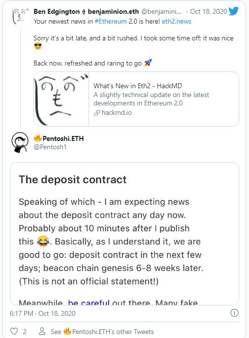 En una publicación de blog del 18 de octubre, Ben Edgington, un desarrollador de Eth2, dijo que esperaba que el contrato de depósito se lance “en unos días” y que “estamos listos”.