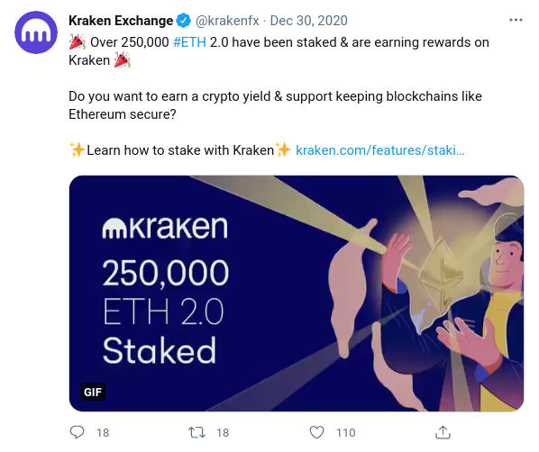 El contrato de depósito de ETH 2.0, que entró en vigencia el 1 de diciembre de 2020, requería un mínimo de validadores para comenzar a funcionar. Lo logró con facilidad y además recibió más de 3.200 ETH de Buterin. Solo los usuarios de Kraken hicieron stake de más de 250.000 ETH.