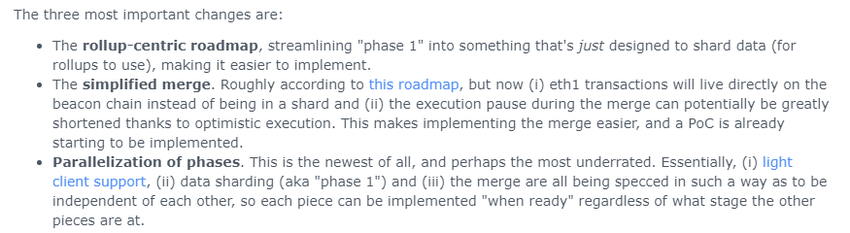 Buterin señala los cambios más importantes: un plan centrado en el rollup, una fusión simplificada y la paralelización de fases. Después de todo lo dicho y hecho, se espera que la red maneje 100.000 transacciones por segundo.