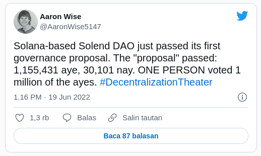 La decisión de implementar o no esta idea surgió en la votación de gobernanza ‘SLND1: Mitigar el riesgo de las ballenas‘ que se anunció el domingo (19/6) a las 15:43 WIB.