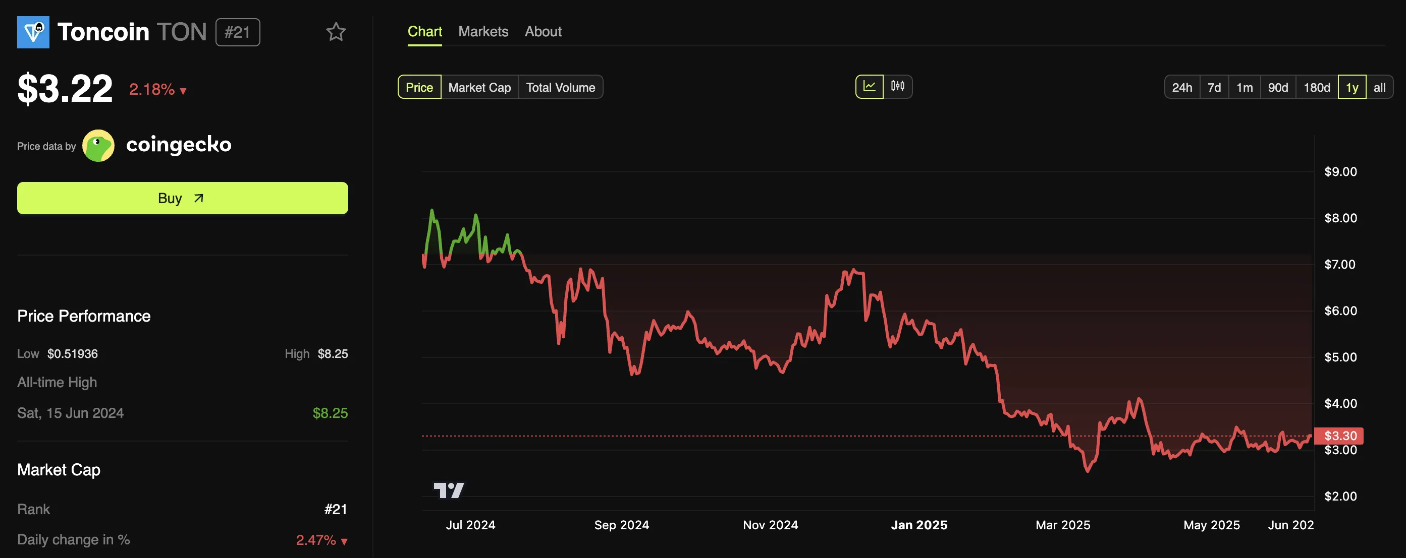 Jin también dio su pronóstico para el precio de TON, que ha disminuido un 53,1% en el último año. Los datos de BeInCrypto mostraron que la altcoin se negociaba a 3,2 dólares al momento de la publicación, un 61,0% por debajo de su máximo histórico de 8,2 dólares.