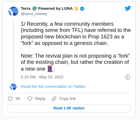 El feed oficial de Twitter de Terra publicó el 24 de mayo que el plan de reactivación para el asediado ecosistema no implica un hard fork dura como se mencionó anteriormente, sino una blockchain completamente nueva.
