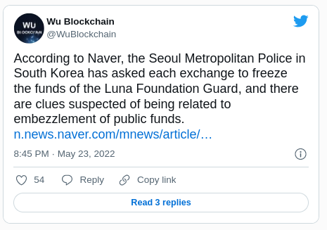 El 23 de mayo, los medios locales informaron que la policía de Corea del Sur se puso en contacto con los principales exchanges de criptomonedas del país con una solicitud para congelar cualquier fondo vinculado a Luna Foundation Guard (LFG).
