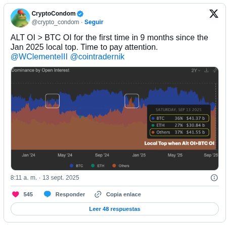 Además, esto señala que el apetito por el riesgo está sobrecalentándose: la gente se aleja del “más seguro” BTC hacia apuestas más especulativas. Instancias previas de este cambio coincidieron con máximos locales del mercado, lo que genera preocupaciones de que el entusiasmo especulativo está alcanzando niveles insostenibles.