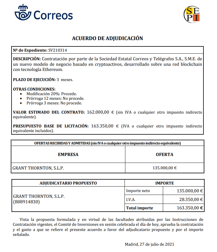 De esta forma, gracias al contrato de 163,000 euros, Correos de España apunta a desarrollar un nuevo modelo de negocio basado criptoactivos.