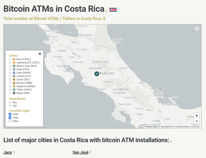 Según Coin ATM Radar, siete ATM se ubican en San José y uno en Jaco, y la mayoría aceptan criptomonedas como: Bitcoin Cash (BCH), Dash, Litecoin (LTC), Zcash (ZEC), Monero (XMR), Dogecoin (DOGE), Tether (USDT) y Ripple (XRP).