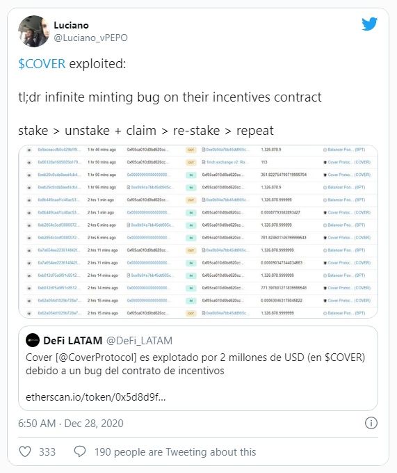 En la mañana del lunes, Cover Protocol sufrió un gran exploit que resultó en la pérdida de millones de dólares en COVER. Condensado por el usuario de Twitter @Luciano_vPEPO, el pirata informático hackeó un error de acuñación infinita en un contrato de incentivos.