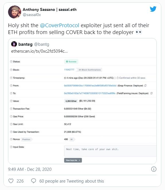 Según Sassano, el hacker de Cover Protocol devolvió los fondos de las ganancias de Ethereum al implementador original. El hacker incluso incluyó un mensaje de precaución para los desarrolladores de protocolos: