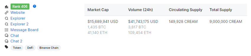 Según el anuncio, el suministro circulante actual de CREAM de 149,928 tokens permanecerá intacto. Los 6.075.000 tokens CREAM quemados se tomarán exclusivamente de los tokens de gobernanza y semilla.