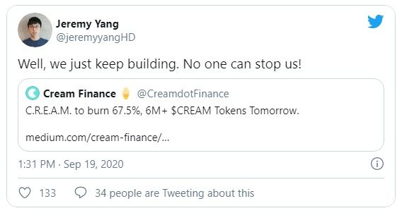 “También se le proporcionó al equipo la misma opción de adquisición de derechos acelerada y de quemado, pero todos los miembros del equipo rechazaron esta opción porque el equipo cree en lo que está construyendo CREAM, con una visión a largo plazo del proyecto. Dado que los tokens de equipo y de asesores no se desarrollan hasta el 8 de febrero, ninguno de estos grupos tendrá votos fuera de los que puedan tener hasta entonces la liquidez minada”.