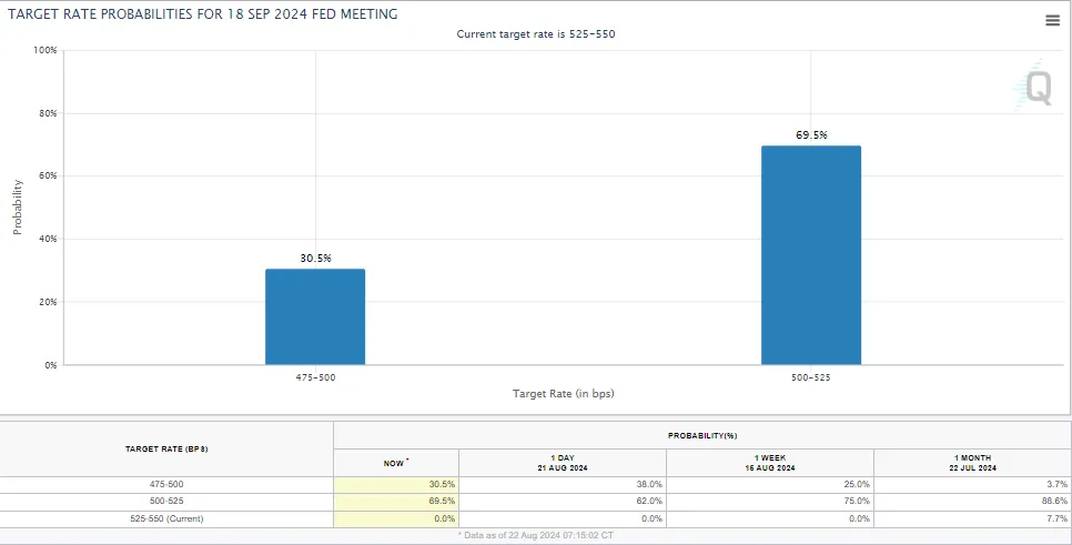 Basado en la herramienta CME FedWatch, la probabilidad de un recorte de tasas de 50 puntos básicos en septiembre ha aumentado al 30.5%, reflejando un creciente sentimiento del mercado hacia una posible relajación de la política. Sin embargo, es importante notar que el presidente de la Fed, Jerome Powell, ha instado consistentemente a la cautela, destacando que reducir las tasas demasiado pronto sigue siendo una preocupación importante.