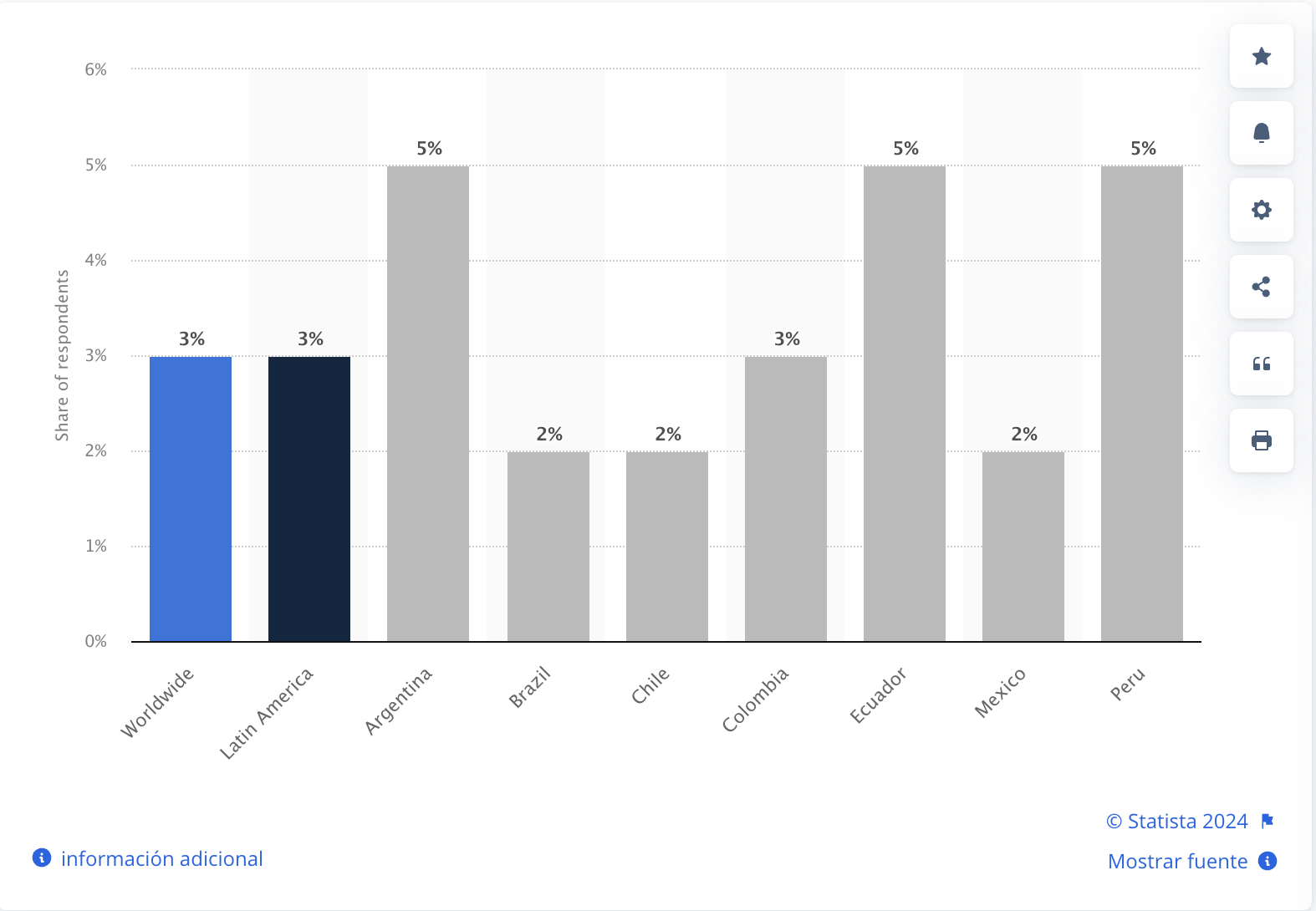 En esta ocasión, Statista mostró que Argentina, Ecuador y Perú dominaron con 5% (por encima del promedio mundial de 3%) el uso de criptomonedas para pagar en juegos durante 2024. El promedio de uso de cripto para pagar en la región también es del 3%.