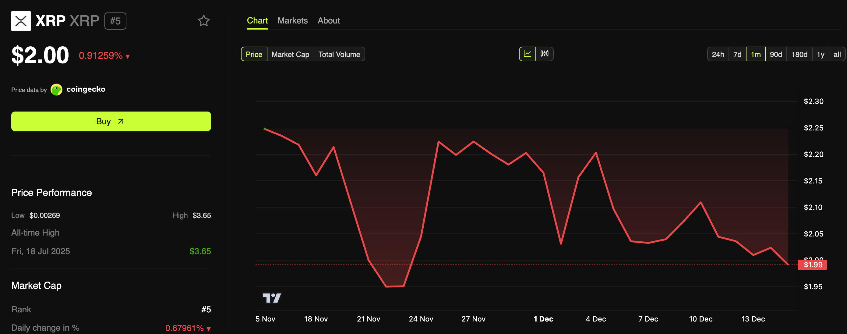 A pesar del crecimiento de los ETF de XRP, el precio del token no ha acompañado el entusiasmo. En el último mes, XRP ha caído cerca de un 13% y actualmente se negocia alrededor de los 2.00 dólares, con variaciones diarias moderadas. Este desacople entre flujos institucionales y precio plantea dudas sobre el corto plazo.