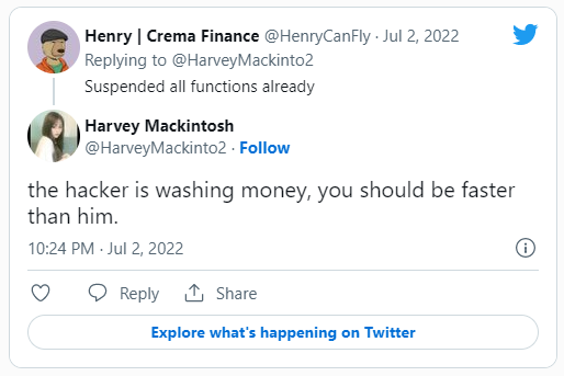 La suspensión temporal de los servicios parece ser un intento de evitar que el hacker agote sus reservas. Pero algunos en la comunidad han dicho que el pirata informático robó aproximadamente el 90% de la liquidez en algunos pools de Crema Finance.
