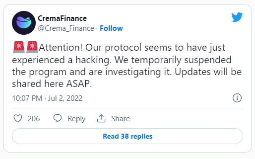 El protocolo de liquidez concentrada basado en Solana, Crema Finance, anunció que suspendería temporalmente sus servicios para investigar un exploit que robó más de 6 millones de dólares del protocolo.