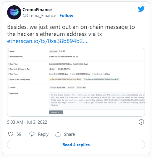 El equipo de Crema también se comunicó con el hacker a través de un mensaje on-chain a su dirección de Ethereum.