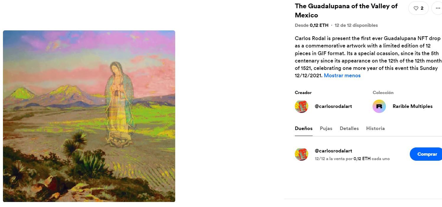 “Carlos Rodal presenta la primera gota NFT guadalupana como obra de arte conmemorativa con una edición limitada de 12 piezas en formato GIF. Es una ocasión especial, ya que se cumple el 5º centenario desde su aparición el día 12 del 12 del mes de 1521, celebrando un año más de este evento este domingo 12/12/2021”.