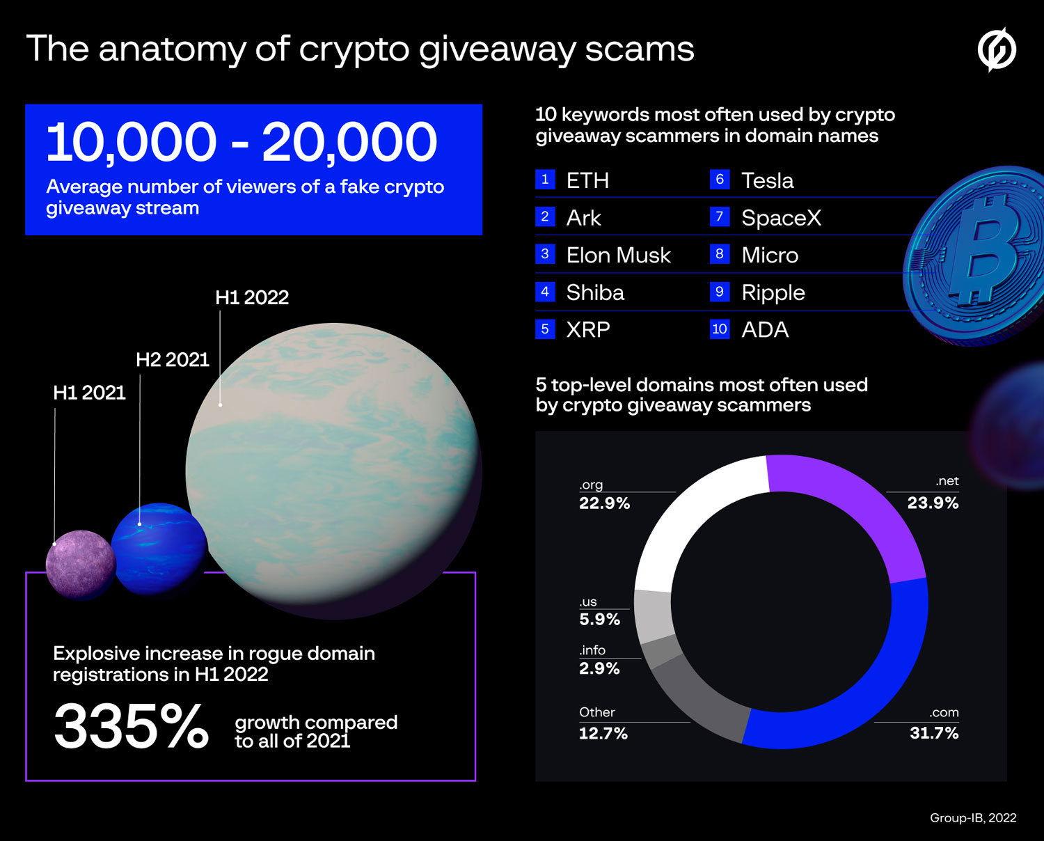 SponsoredEn la publicación, Group-IB también compartió las 10 palabras claves más utilizadas por los estafadores. Las 5 más populares son “ETH”, “Ark”, “Elon Musk”, “Shiba” y “XRP”.