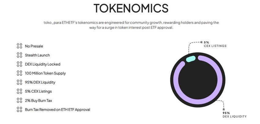 Además de la conexión ERC-20, $ETHETF celebra la aprobación del Ethereum ETF levantando el impuesto de quema del 2%. Su debut en Uniswap, sin asignación de equipo, es un lanzamiento equitativo, asignando el 95% de la oferta a la liquidez de DEX y el 5% para listados en exchanges centralizados.