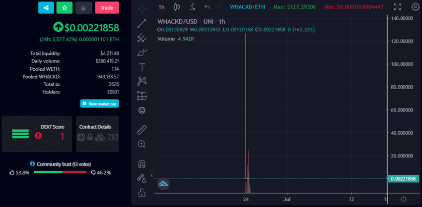 Al final del artículo, el token WHACKD opera con un fuerte aumento de 2,077% en las últimas 24 horas, cotizado en 0,00221858 dólares según la herramienta DEXTools.