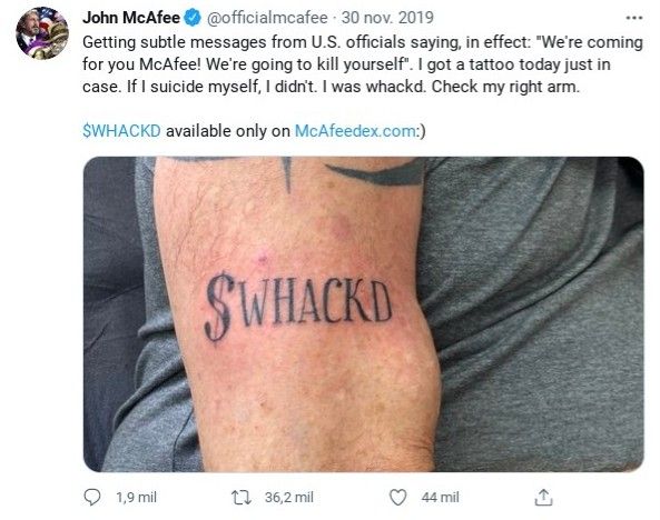 “Recibir mensajes sutiles de funcionarios estadounidenses que decían, en efecto, ‘¡Vamos tras usted, McAfee! Te vamos a matar’. Hoy me hice un tatuaje por si [eso pasa]. Si me suicido, no lo hago. Fui asesinado. Mira mi brazo derecho. $WHACKD solo está disponible en McAfeedex :)”.
