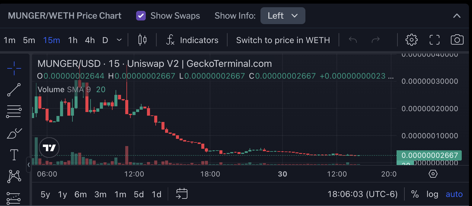 En este caso, la mayoría de los traders que pudieron aprovechar la explosión de la misma criptomoneda ya recuperaron sus ganancias. Como resultado, la capitalización actual de MUNGER ha caído por debajo de los 20,000 dólares.