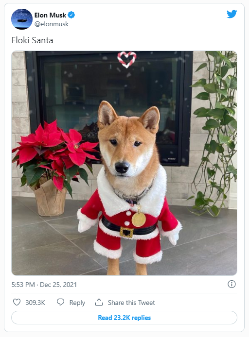 Un tweet de Elon Musk que contenía una foto de su perro con el mensaje “Floki Santa” fue suficiente para hacer que una criptomoneda meme, que lleva el mismo nombre, se disparara un 18,840% en solo 48 horas.