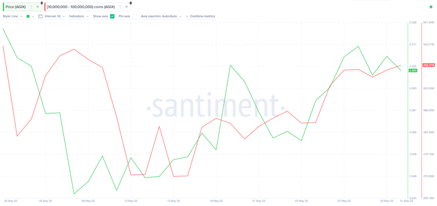 Entre el 16 y el 31 de mayo, las ballenas con saldos de 1 millón a 10 millones de tokens AGIX han realizado una acumulación significativa. El cuadro a continuación muestra cómo agregaron otros 24 millones de AGIX a sus saldos durante ese período.