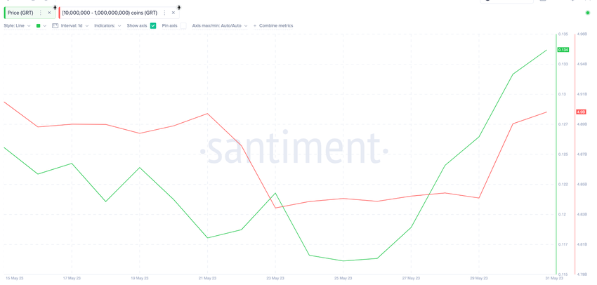 Entre el 23 y el 31 de mayo, las ballenas de criptomonedas que tenían saldos de 10 millones a 1,000 millones de tokens GRT agregaron 70 millones de tokens GRT a sus tenencias.