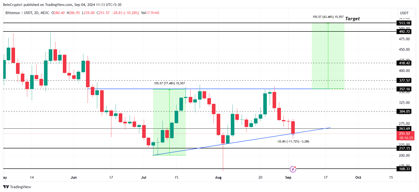 Si TAO logra superar el nivel de 357 dólares, el token podría ver un aumento del 43%, apuntando a un precio de 513 dólares. Este escenario marcaría una fuerte recuperación y podría reavivar el interés de los inversores en el espacio cripto de IA.