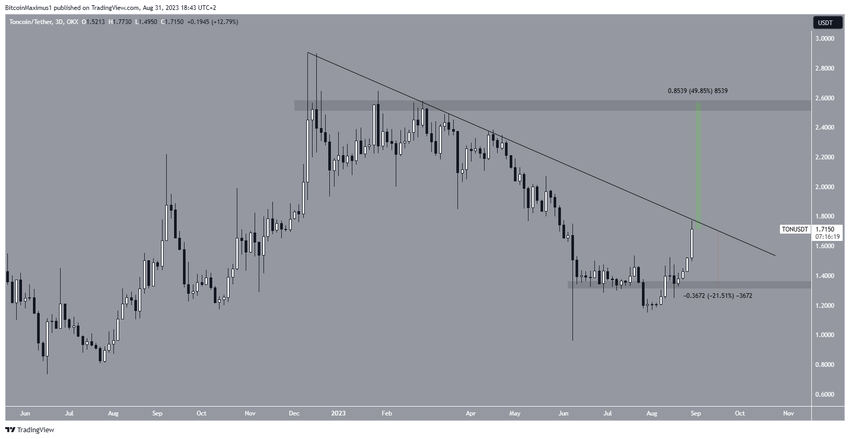 TON está intentando salir de la línea de resistencia descendente. Es probable que el precio se mueva a la siguiente resistencia horizontal de 2.60 dólares si tiene éxito. Esto supondría un aumento del 50%, si se mide con respecto al precio actual.