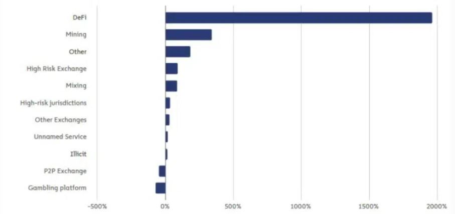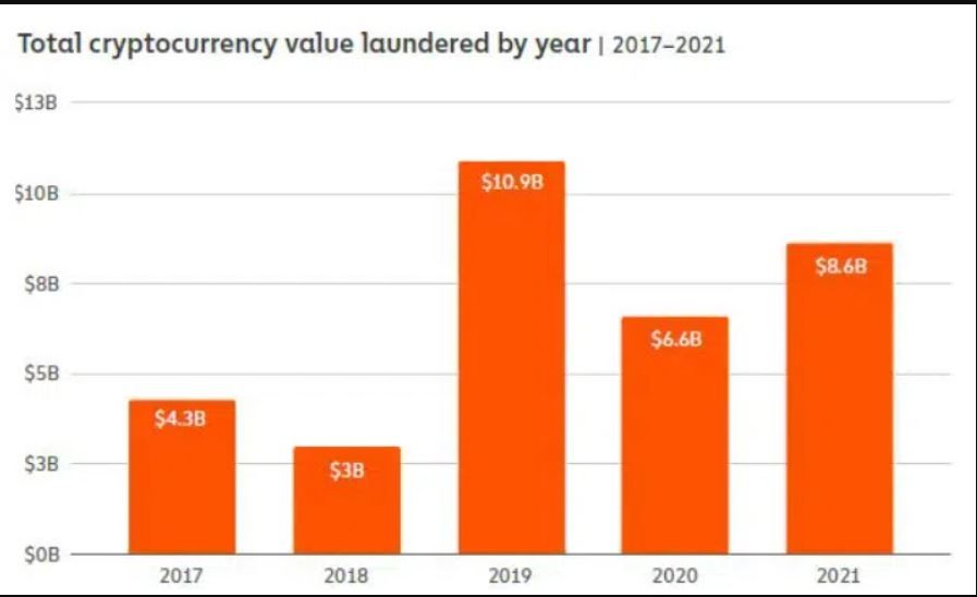 Si bien las estafas representan la mayor parte de la actividad ilegal, los delincuentes también han utilizado exchanges para lavar dinero, lo que representa 8.6 mil millones de dólares, 30% más que el año anterior, pero menos que el máximo histórico de 2019.