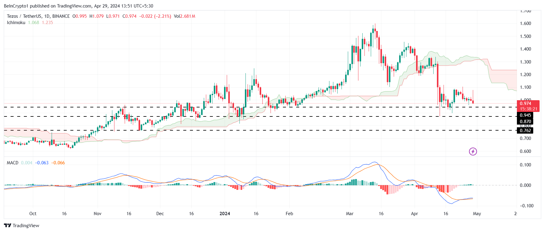 El precio de Tezos (XTZ) está flotando por encima del soporte crucial de 0.945 dólares, lo que provocaría la caída a 0.87 dólares, el punto más bajo para XTZ desde principios de año.