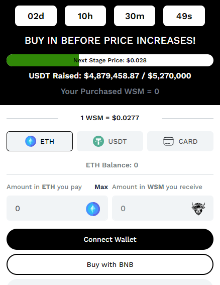 Aún estando apenas en etapa de ICO, la memecoin ha ido a un ritmo trepidante que está haciendo voltear cada vez más a menudo a más y más actores, haciendo que rompa sus propios récords de asignación de tokens y de recaudación de fondos. “Sabemos todo lo que hay que saber sobre la creación de marcas en la nueva era de las finanzas, que es exactamente la razón por la que tendremos éxito nuevamente con WSM”, dicen desde su plataforma web.