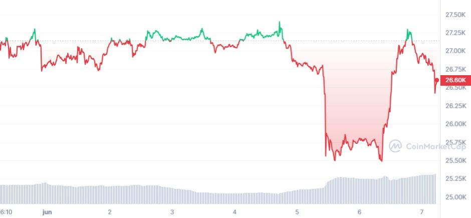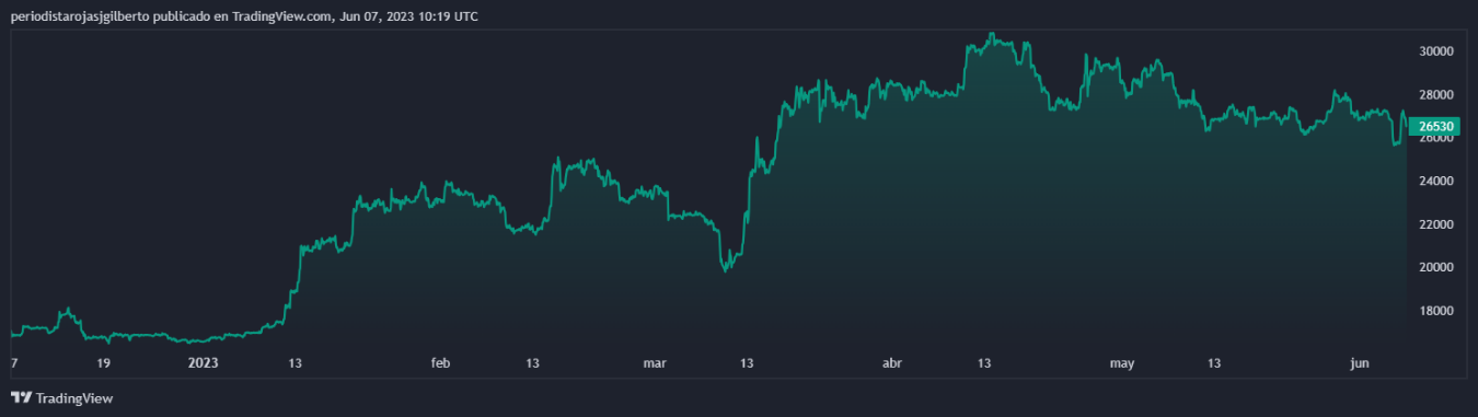 El fin de semana, el precio de BTC se deslizó de los 27.000 dólares a los 26.700 aproximadamente, para luego caer este martes a los 25.510 dólares por varias horas y, posteriormente, recuperarse hasta superar, de nueva cuenta, los 26.400 dólares.