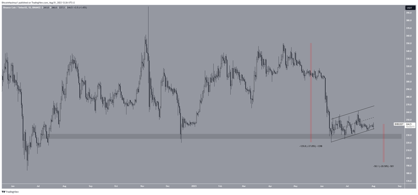 Por el contrario, el precio del BNB se ha negociado dentro de un canal paralelo ascendente, lo que se considera un patrón bajista. El hecho de que el precio se negocie en la parte inferior de este canal se alinea aún más con la posibilidad de una ruptura.