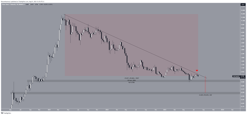 El precio de THETA ha caído bajo una línea de resistencia descendente desde el precio máximo histórico de 15.88 dólares registrado en abril de 2021. La línea ha estado vigente durante 840 días y ha catalizado una disminución del precio del 95%.
