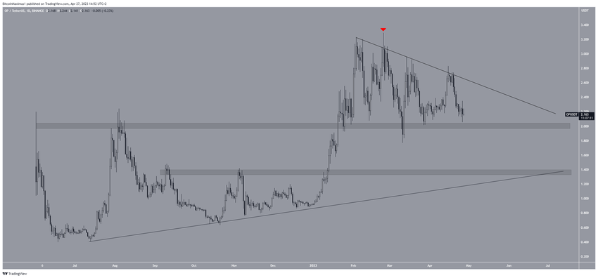 El precio de OP ha caído bajo una línea de resistencia descendente desde principios de febrero. Además de la línea, el precio también reaccionó al área de soporte horizontal de 2 dólares.